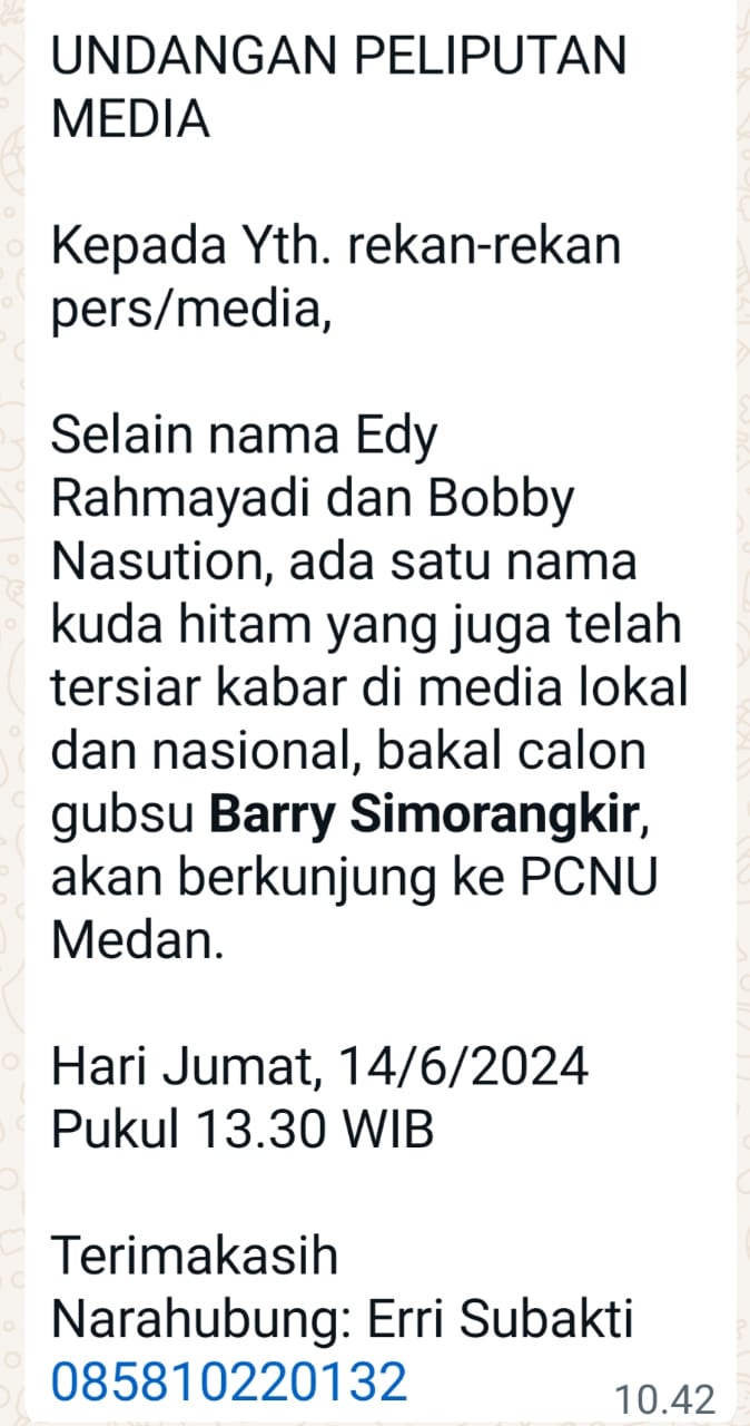 Kejadian ini bermula saat, salah seorang bernama Erri Subakti selaku Nara Hubung, dan atas nama Pengurus PC NU Kota Medan, menyebarkan Undangan Peliputan Media, agar para Wartawan datang melakukan Peliputan Pemberitaan, karena akan ada Kunjungan salah satu Calon Gubsu bernama Barry Simorangkir ke Kantor PC NU Kota Medan, Jumat (14/6/2024). 14/6/2024